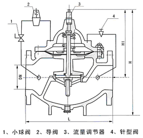 400X流量控制閥結構圖( 1.球閥 2.導閥 3.流量調節閥 4.針閥)