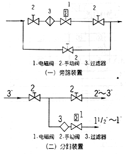 3、在電磁閥發生故障時,為了及時隔離電磁閥,并保證系統正常運行,最好安裝旁路裝置(如圖一)。